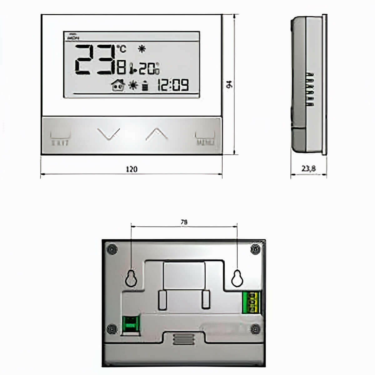 Termostaten imponerer med sit førsteklasses udseende: Frontpanelet er lavet af 3 mm tykt glas, som ikke kun ser moderne ud, men også er særligt robust. Det 3,6-tommer baggrundsbelyste LCD-display sikrer nem læsbarhed, selv under dårlige lysforhold. Touch-knapperne komplementerer det elegante design og tilbyder samtidig intuitiv betjening.