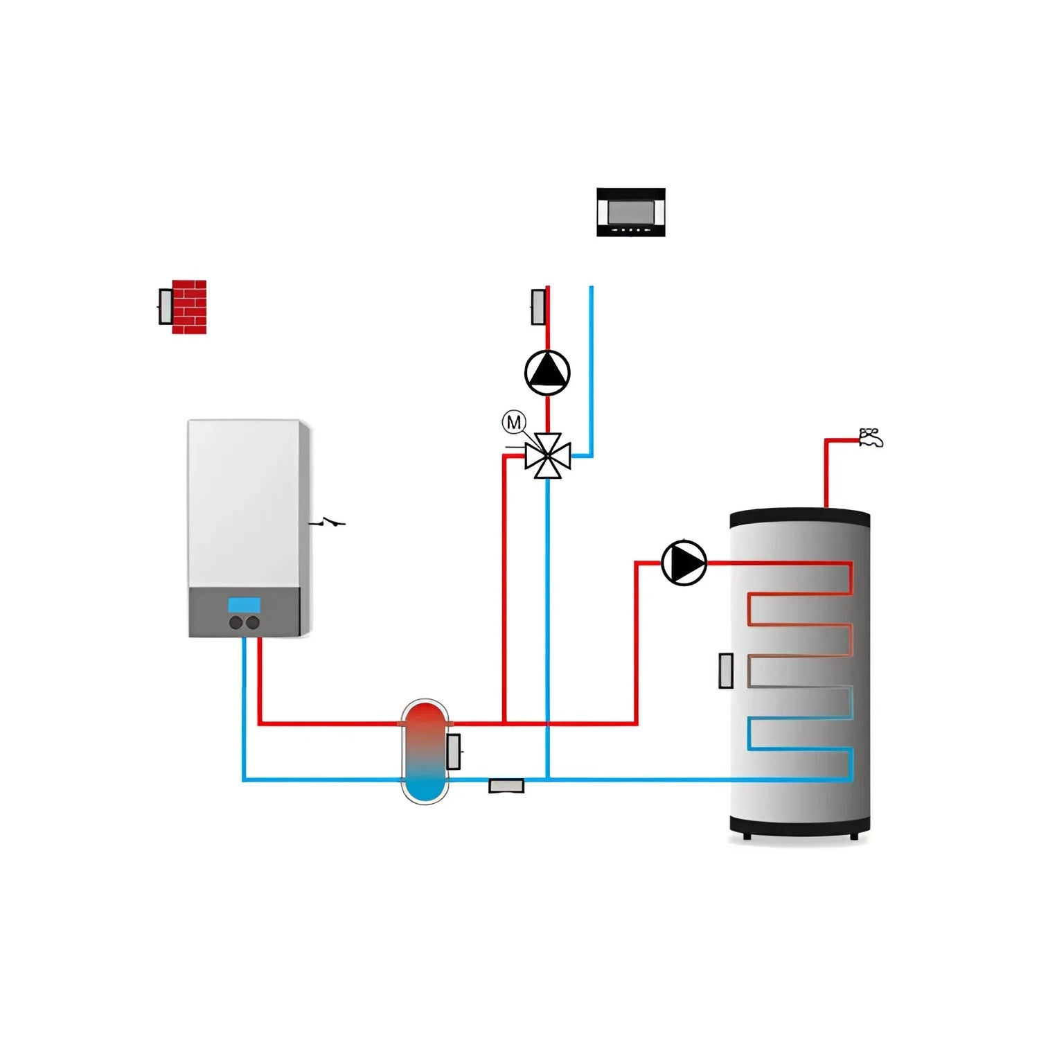 Denne varmekredsstyring sikrer konstant, vejrafhængig regulering af fremløbstemperaturen ved hjælp af den medfølgende udetemperaturføler. Den styrer også blandeventilmotoren for at sikre en øget returstrøm ved brug af en firevejsblander. Dette effektiviserer opvarmningen, og du drager fordel af optimal energiudnyttelse.