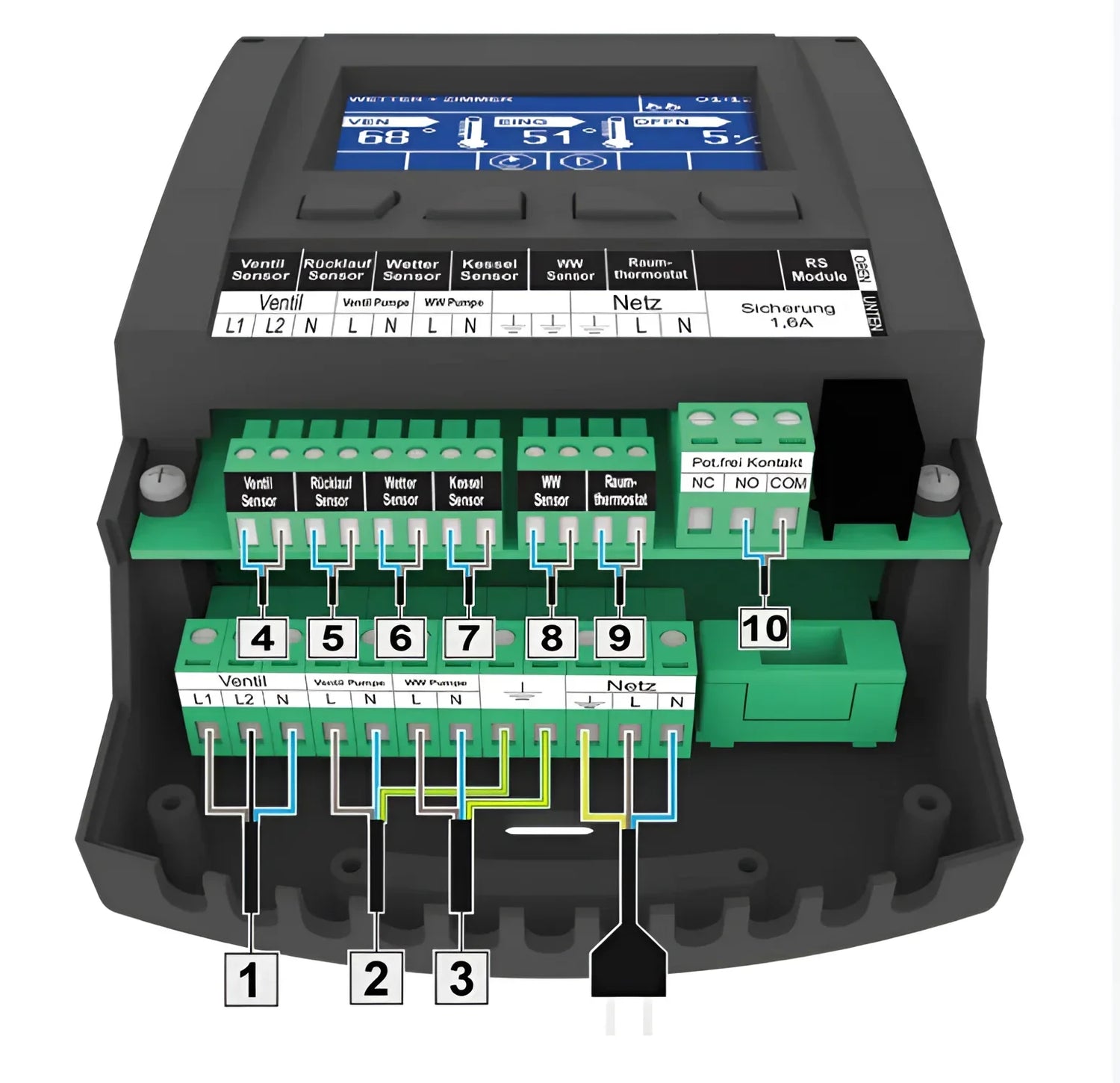 Varmekredsstyringen tilbyder også en potentialfri udgang til styring af eksterne enheder såsom kedler eller varmepumper. De udvidelige styringsmuligheder – for eksempel via en valgfri rumtermostat – gør det muligt at tilpasse styringen endnu bedre til dit varmesystems behov. En trådløs udvidelse er også tilgængelig som ekstraudstyr.