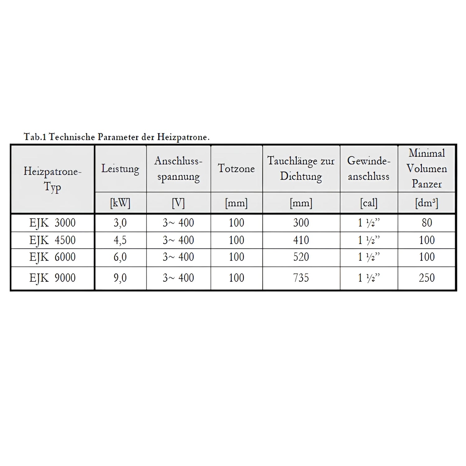 Varmepatronen i den komplette pakke fås i forskellige effektklasser, specielt designet til 1,5 kW, 2,0 kW, 3,0 kW ved 230 V og 4,5 kW, 6,0 kW og 9,0 kW ved 400 V. Disse varianter muliggør optimal tilpasning til varmesystemets individuelle energibehov.