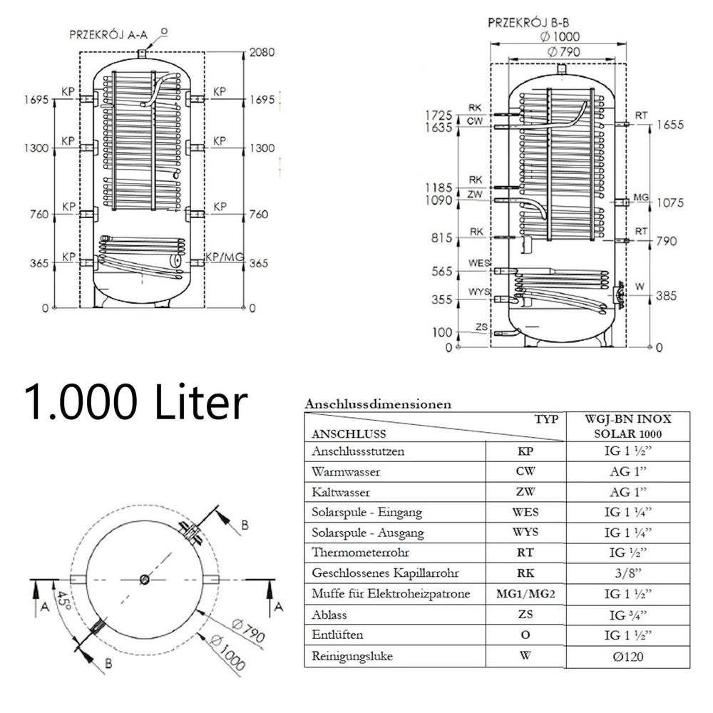 Le WGJ-BN INOX SOLAR est un ballon tampon combiné pour la production d'eau chaude sanitaire et d'eau de chauffage, doté d'un serpentin de chauffage en acier inoxydable intégré servant d'échangeur de chaleur. Conçu pour être intégré à des systèmes de chauffage central avec chaudières, pompes à chaleur ou pour l'utilisation de l'énergie solaire, il permet à la fois le stockage d'énergie thermique et la production continue d'eau potable.