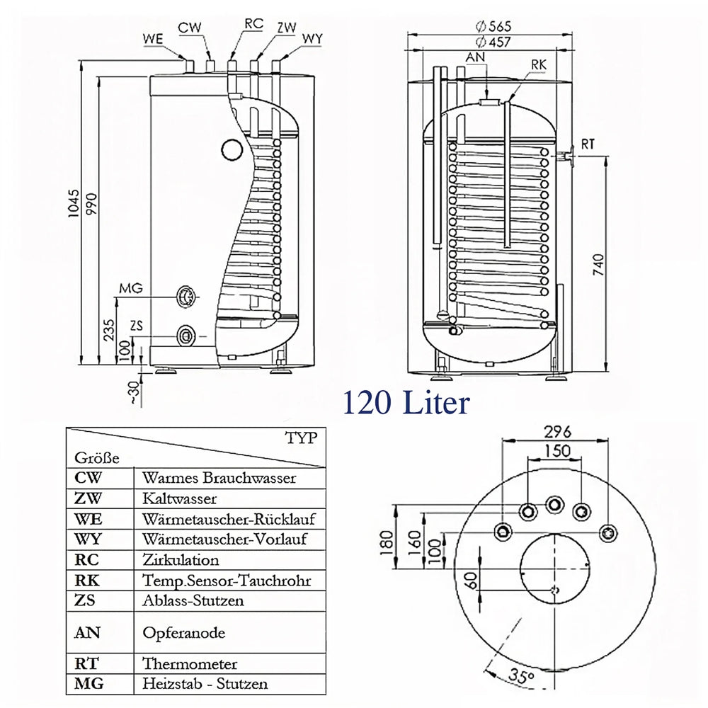S volumenom od 120 litaraS površinom izmjenjivača topline od 1,4 m², ovaj spremnik nudi dovoljan kapacitet za potrebe tople vode od 100 do 180 litara. Toplinska izolacija od gusto pjenaste poliuretanske pjene minimizira gubitak topline.