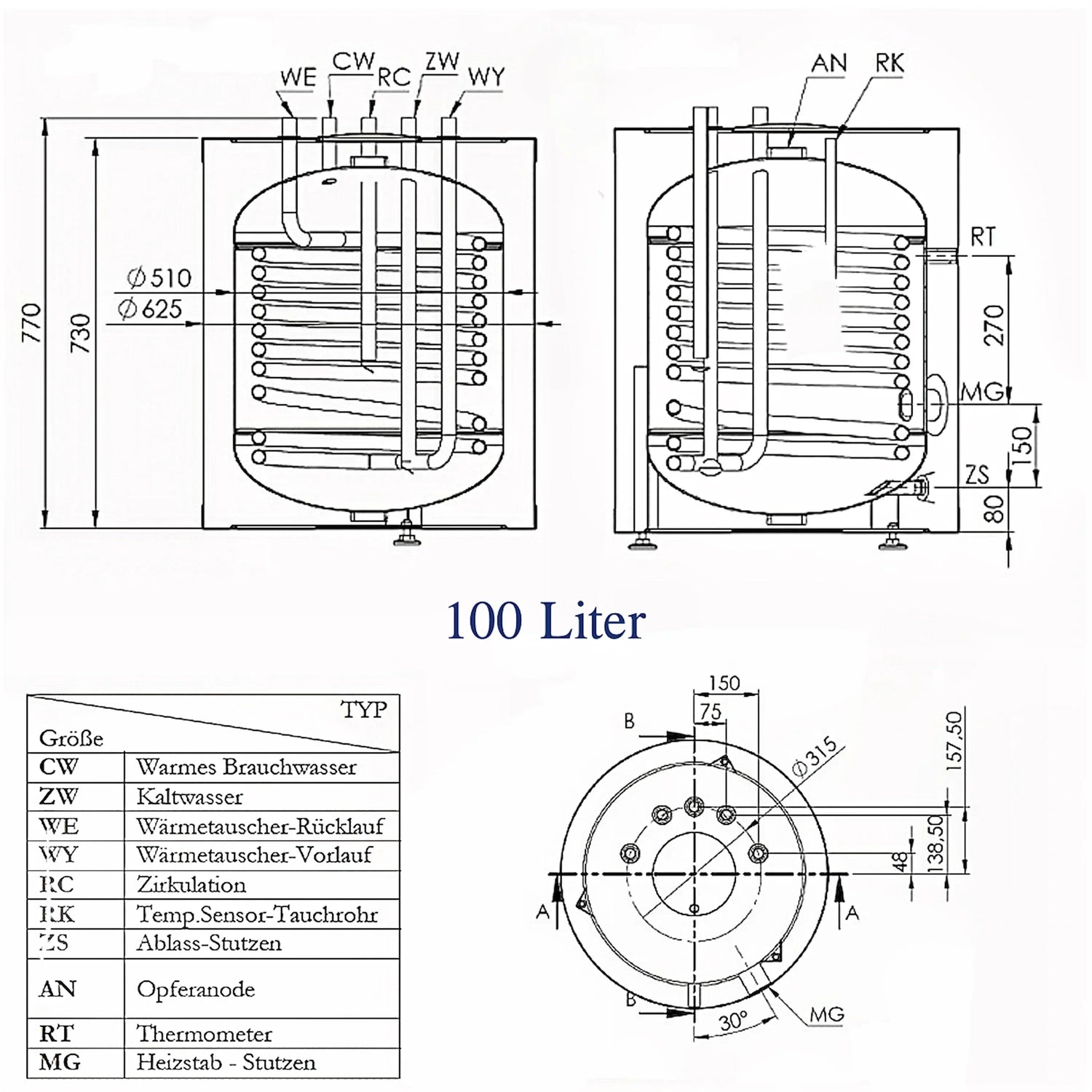 • 100 litrų karšto vandens bakas su 1 šilumokaičiu, įskaitant izoliaciją