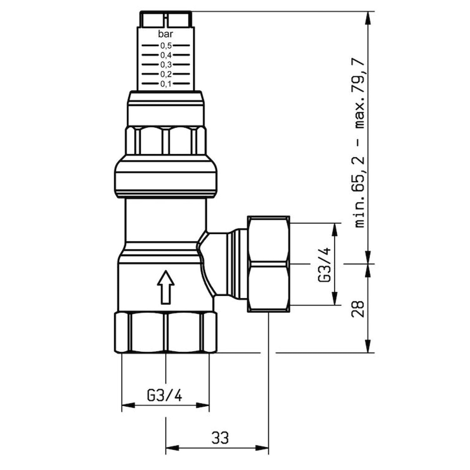 Prevádzkový teplotný rozsah: max. 95 °C (krátkodobo do 120 °C). Prevádzkový tlak: max. 6 bar. Plynule nastaviteľný diferenčný tlak: 0,1/0,5 bar. Materiál puzdra: mosadz. Pripojenia: Vstup vnútorný závit G¾, výstup ploché tesniace skrutkové pripojenie s prevlečnou maticou G¾.